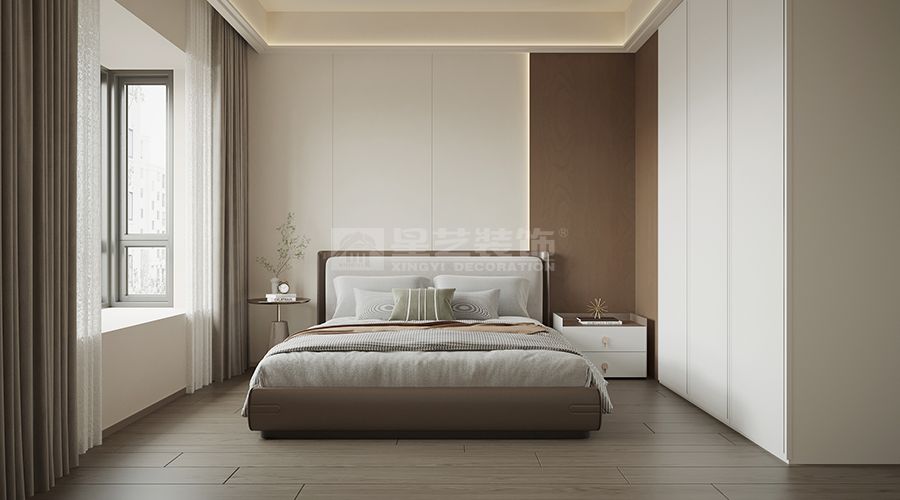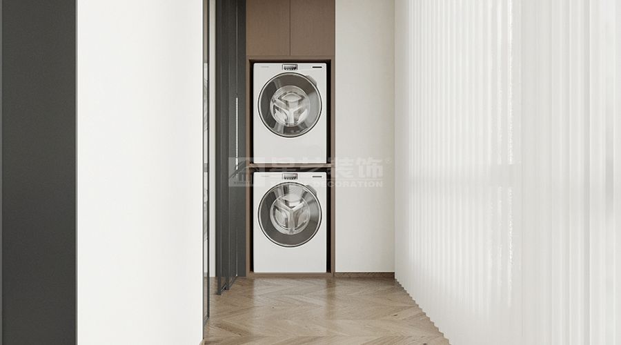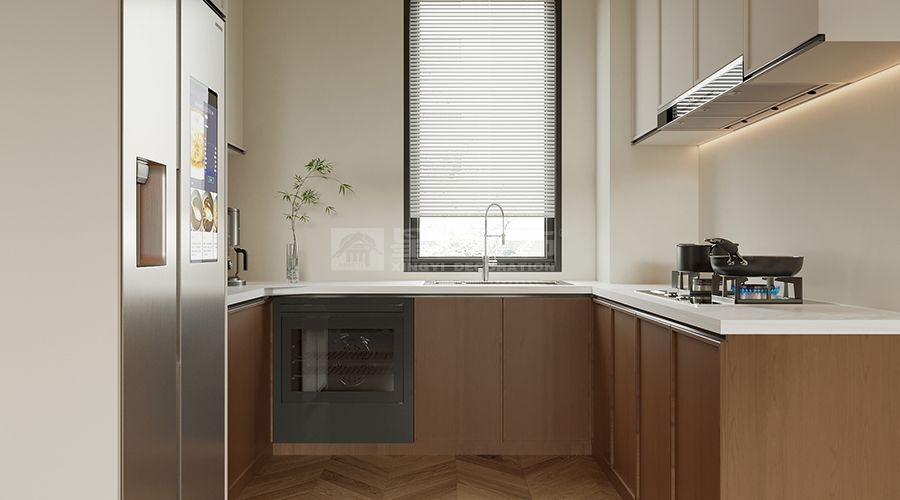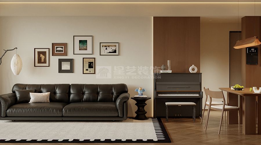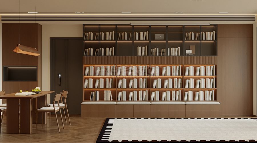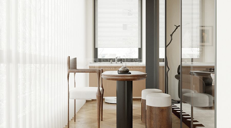 低饱和度暖色与黑色元素结合,开放式书房打造洄游动线,阳台木百叶光影烘托诗意氛围